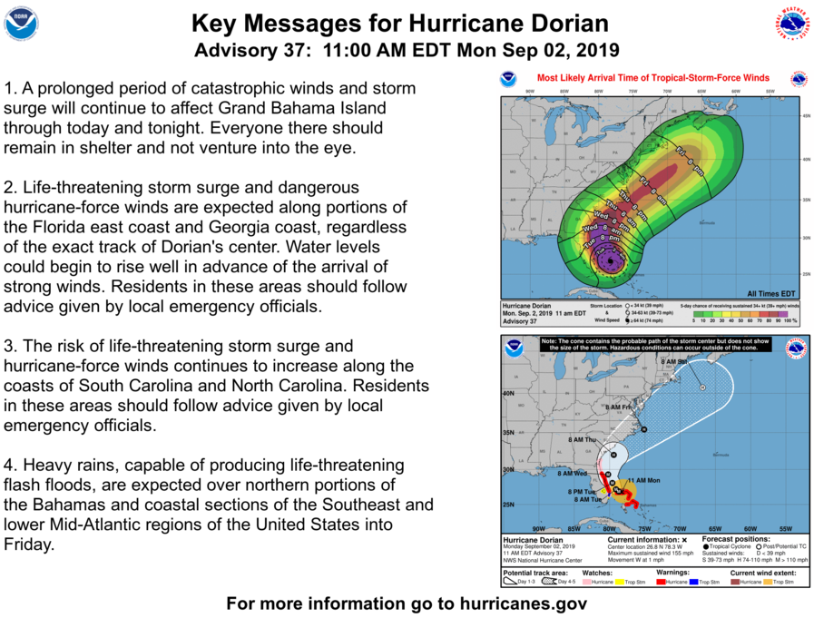 In its 11 a.m. update, the National Hurricane Center said Hurricane Dorian maximum sustained winds had dropped to 155 mph, making it a Category 4 hurricane with gusts still up to 190 mph. The storm continues to slog over Grand Bahama Island, about 30 miles east of Freeport, Grand Bahama and about 110 miles east of West Palm Beach.