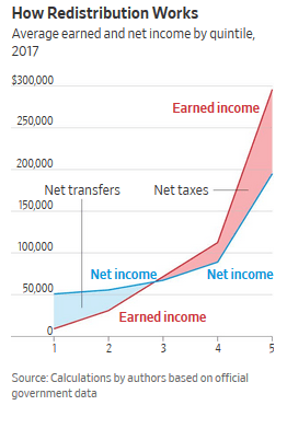 The average bottom-quintile household earns only $4,908, while the average top-quintile one earns $295,904, or 60 times as much. But using official government data sources on taxes and all transfer payments to compute net income produces the more complete comparison displayed in the nearby chart.