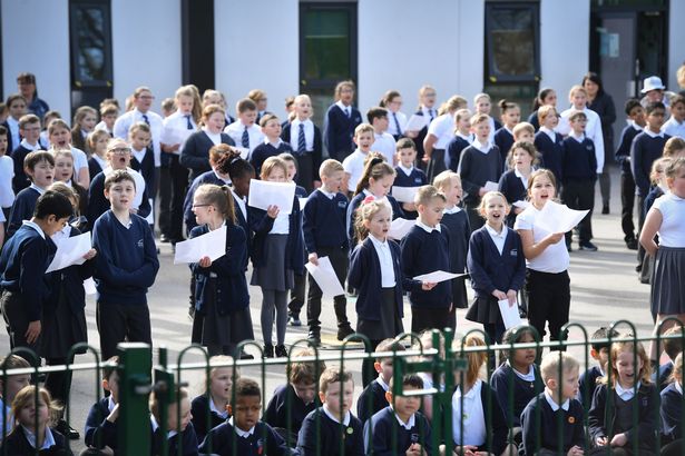 Hundreds of primary school pupils took to their playground to perform for older residents isolating from coronavirus in the flats opposite.