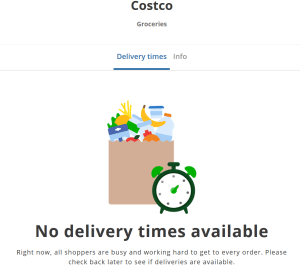 As a result, all grocery delivery services in my area are severely backed up or unavailable. I placed my last typical grocery order from Meijer via Shipt a week ago, but no delivery windows have opened up. The same is true for Costco, Whole Foods, Kroger and Target. This is the message from Costco. Their 2-day service is now running 5-6 or more days. Also, many items are just not available.