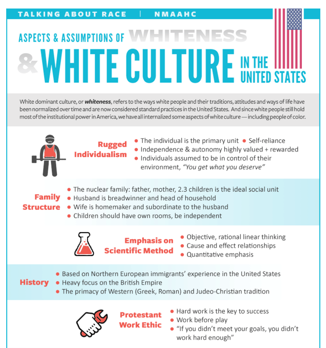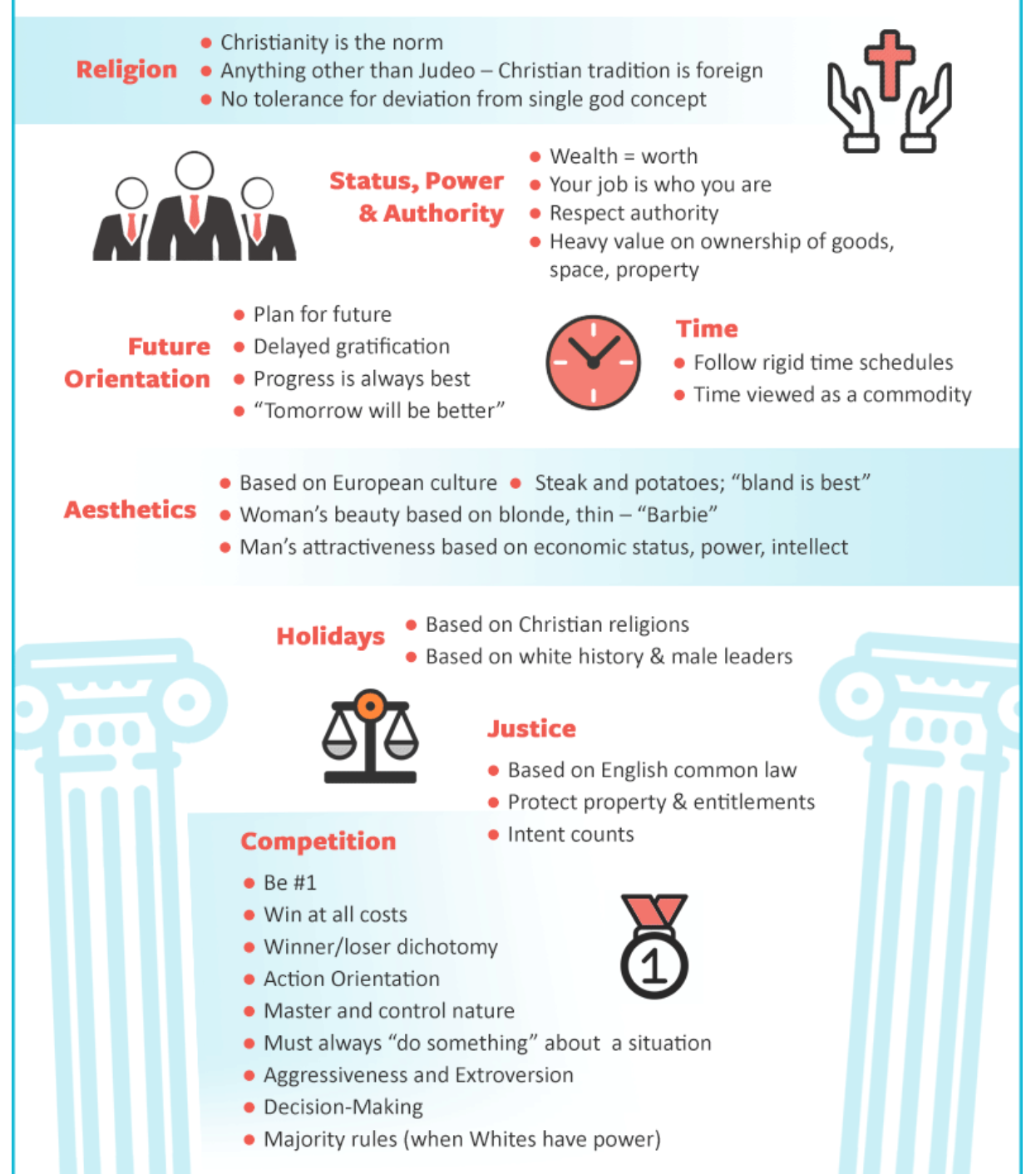 “These “aspects and assumptions” include but are not limited to “rugged individualism,” respect for authority, being polite, and even punctuality. The graphic continues, claiming that white people place a premium on hard work, competitive drive, the “nuclear family,” objectivity, the “scientific method,” self-reliance, and hope.