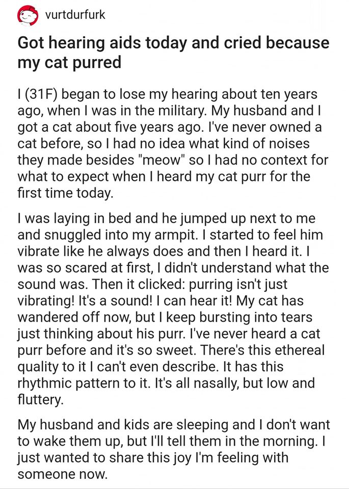 This is a really great collection. My face started to hurt from smiling. LOL The first three were especially good. I teared up at the woman who was deaf hearing a cat purr for the first time. 🙂 And, the little girl holding the kitty is just precious. And, I love that painting of the woman at the beach. But all of them are great.