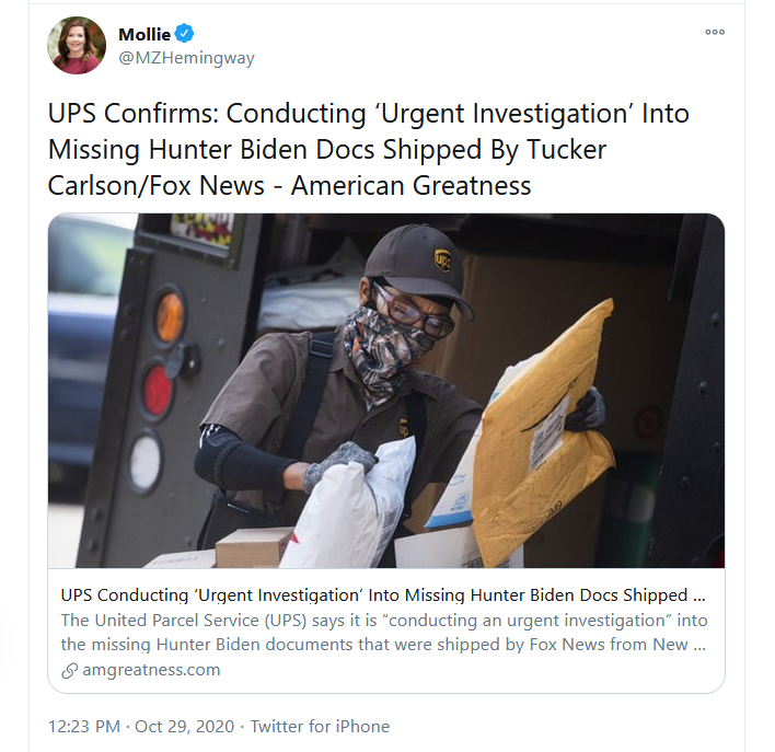 UPS confirmed to left-wing financial news website Business Insider that the cache of documents, mentioned by Fox News host Tucker Carlson on his Wednesday night show, disappeared somewhere within it’s network.