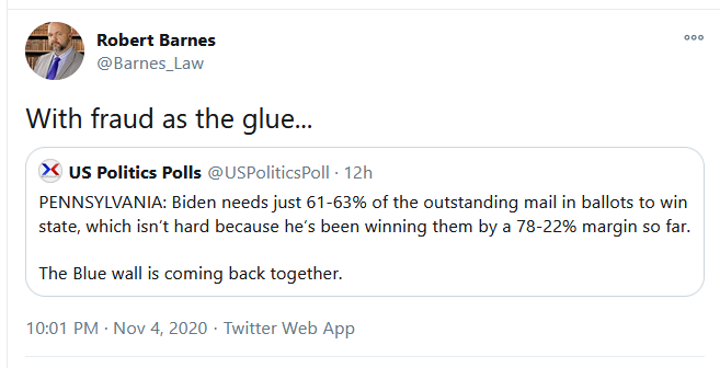 There are huge chain of custody issues in this process. Earlier, hours went by on the ballot accounting floor where there were virtually no ballots being processed at all. Then they were suddenly swarmed with ballots in the middle of the night when they were the least number of challengers on the accounting floor.