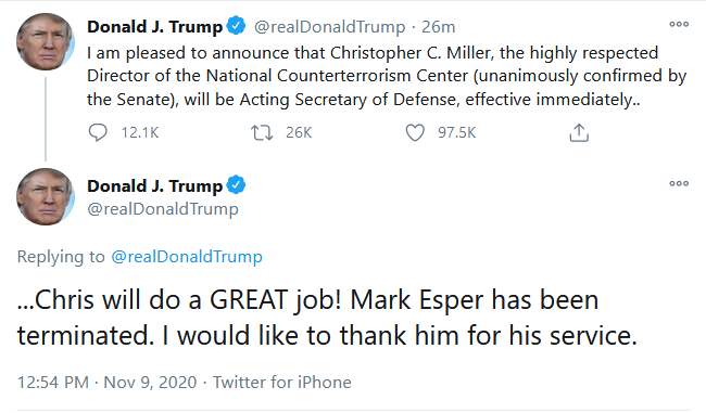 “I am pleased to announce that Christopher C. Miller, the highly respected Director of the National Counterterrorism Center (unanimously confirmed by the Senate), will be Acting Secretary of Defense, effective immediately,” Trump wrote.