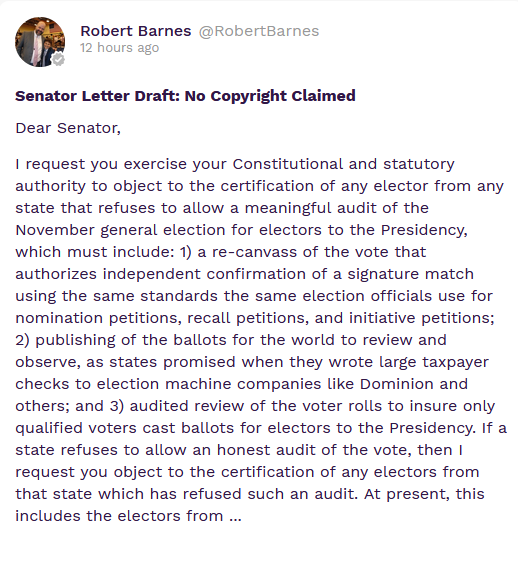 I really hope so. McConnell told the Senate Republicans not to get involved. So, I wrote tp my 3 Republican Congressional Critters and reminded them they are working for us and not McConnell. This election was filled with fraud and needs to be righted.