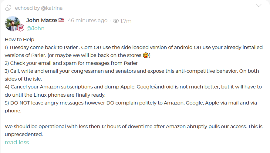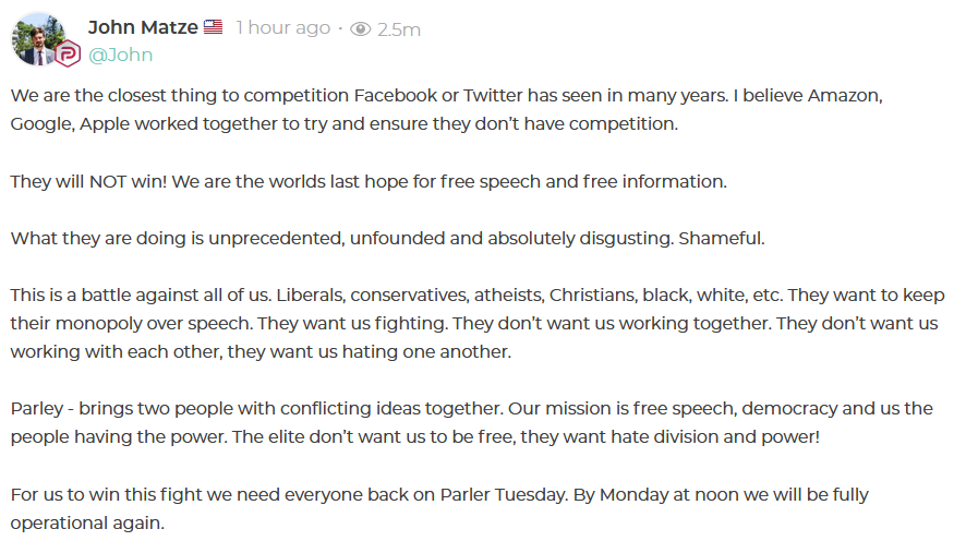 I’m just going to continue to put articles in this thread that are about the general persecution we are facing, not merely things about Parler. Hope that’s OK. Over tomorrow we’ll likely have dozens of things to read and digest.