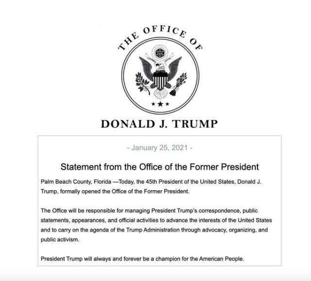 A statement from the office Monday night said it will manage Trump’s correspondence, public statements, appearances and official activities to “advance the interest of the United States.”
