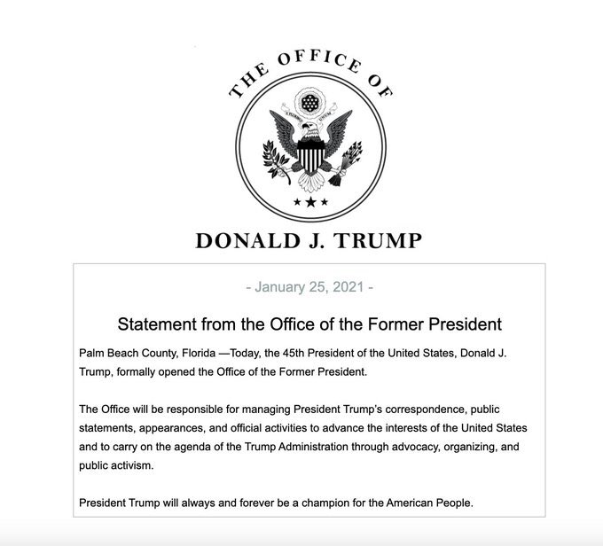 A statement from the office Monday night said it will manage Trump’s correspondence, public statements, appearances and official activities to “advance the interest of the United States.”