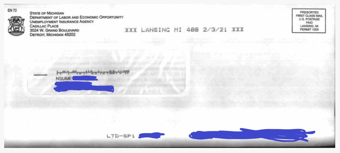 Over the past few months, I have received mail at my address for a person with my last name, but the first name of “Nsume”. This mail is from the Michigan Unemployment Insurance Agency. This person had apparently applied for unemployment benefits using my address.