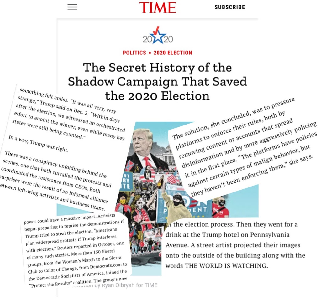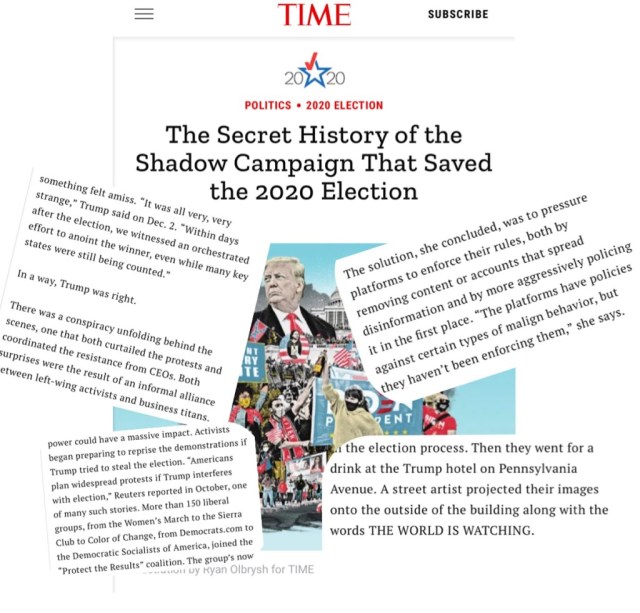 The bottom line of the Time election exposé: The election wasn’t rigged; it was “saved”. It wasn’t big tech collusion; it was “suppression of disinformation”. It wasn’t threats of violence; it was “preserving the peace”. You weren’t manipulated; you were “protected”. As was the outcome.