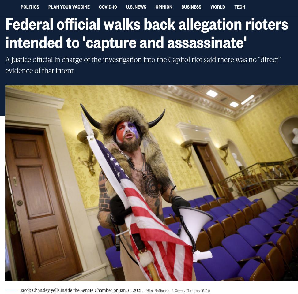 4. There was no plan to abduct or otherwise harm government officials. A DOJ official walked back a federal claim that Capitol rioters ‘intended to capture and assassinate elected officials.’” Specifically, “Washington’s acting U.S. Attorney, Michael Sherwin, said in a telephone briefing, ‘There is no direct evidence at this point of kill-capture teams and assassination.’” Over and over, no evidence has emerged for the most melodramatic media claims — torn out Panic Buttons and plots to kill Vice President Mike Pence or Mitt Romney.