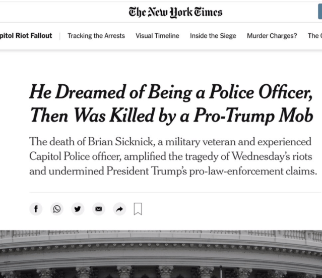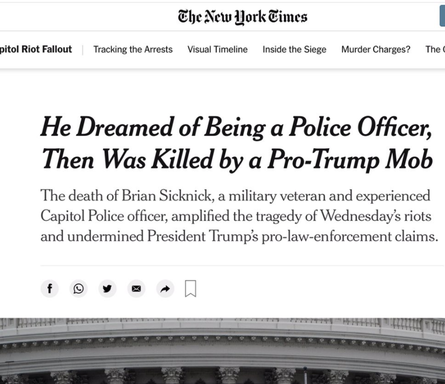 1. Officer Brian Sicknick was murdered by pro-Trump rioters at the Capitol who hit him on the head with a fire extinguisher, after which he was rushed to the hospital and put on life support.
