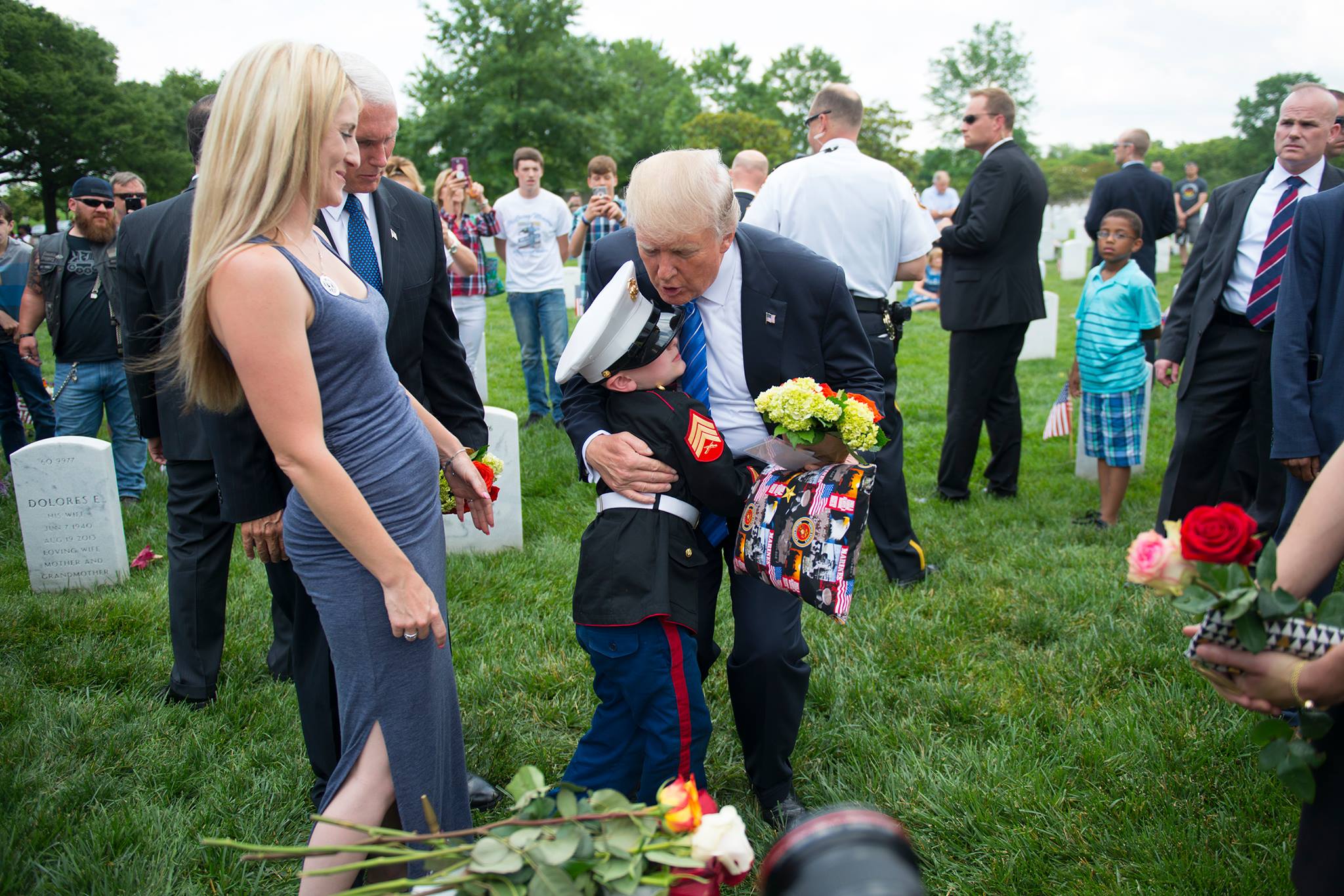 President Donald J. Trump and Vice President Mike Pence talk with Christian Jacobs, 6, and his mother Brittany at the grave of his father in Section 60 of Arlington National Cemetery, Arlington, Va., May 29, 2017. Christian visits with his mother, Brittany, every year for Memorial Day. (U.S. Army photo by Elizabeth Fraser/Arlington National Cemetery/released)