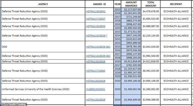Grants from the Pentagon included $6,491,025 from the Defense Threat Reduction Agency (DTRA) from 2017 to 2020 with the description: ‘Understanding the risk of bat-borne zoonotic disease emergence in Western Asia.’ . . .