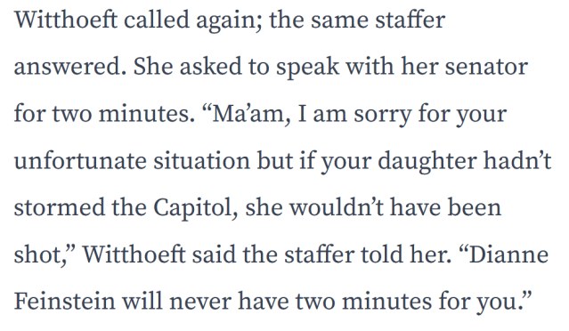 A few weeks after Ashli was killed, Witthoeft said she finally took her head off her pillow and started making calls. A staffer for Senator Dianne Feinstein’s (D-Calif.) office at first hung up on her, insisting he didn’t know who Ashli Babbitt was. Witthoeft called again; the same staffer answered. She asked to speak with her senator for two minutes. “Ma’am, I am sorry for your unfortunate situation but if your daughter hadn’t stormed the Capitol, she wouldn’t have been shot,” Witthoeft said the staffer told her. “Dianne Feinstein will never have two minutes for you.”