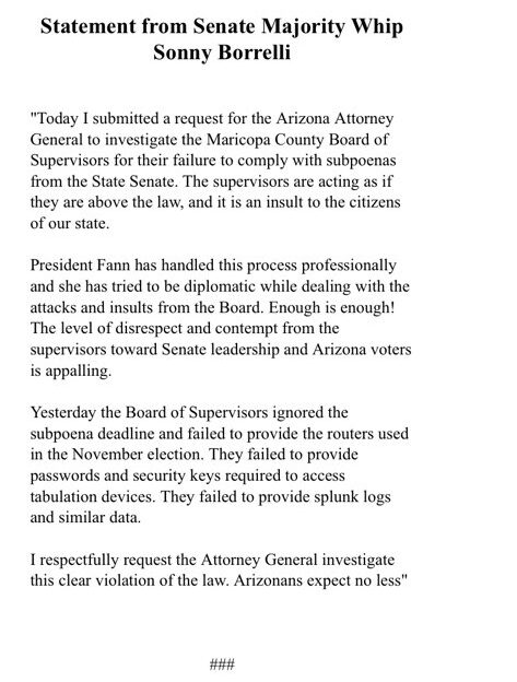 Maricopa County Supervisors continue to try to thwart America’s Audit by not complying with subpoenas. Unfortunately for them, our State Senate will not back down. The People demand answers.
