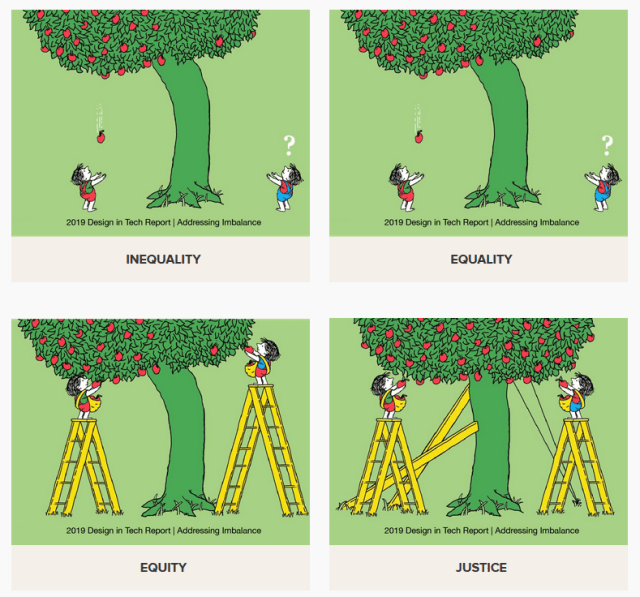 In the illustration below, two individuals have unequal access to a system — in this case, the tree that provides fruit. With equal support from evenly distributed tools, their access to the fruit still remains unequal. The equitable solution, however, allocates the exact resources that each person needs to access the fruit, leading to positive outcomes for both individuals.