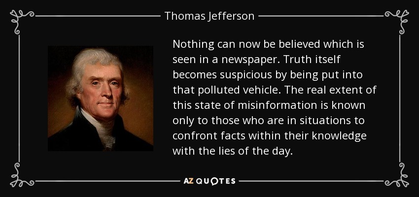 “Nothing can now be believed which is seen in a newspaper. Truth itself becomes suspicious by being put into that polluted vehicle." — Thomas Jefferson, defender of the free press, and media critic.