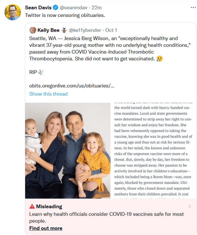 Yup. Now Twitter really is censoring obituaries. You cannot retweet, share or like this tweet. Because Covid vaccine is “safe for most people” and the tweet is “misleading”!