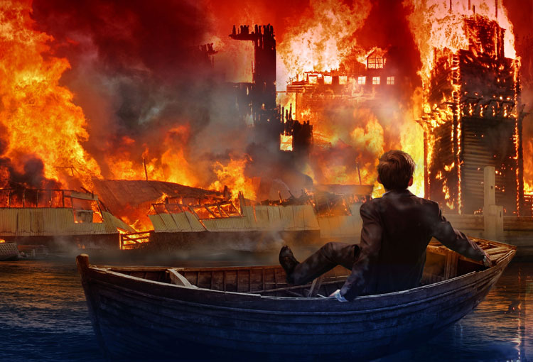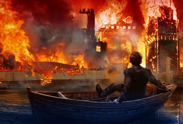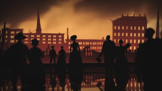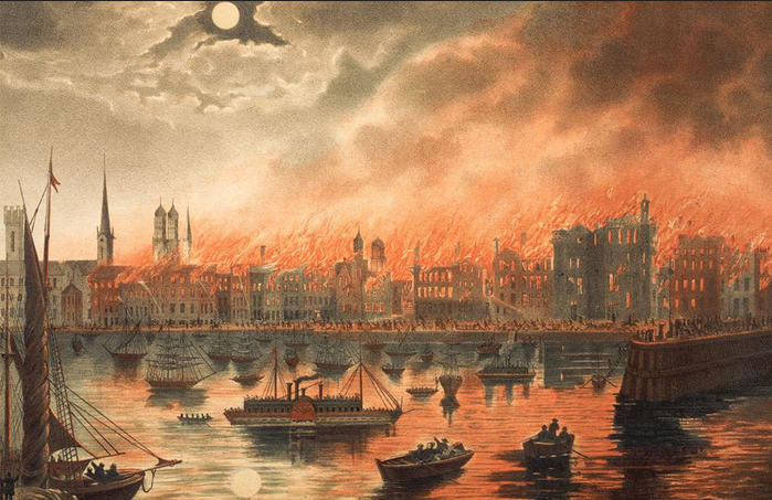 By midnight, the gasworks explodes, fueling the fire and leaving most of the city without lights. Shortly after that, flames engulf Conley’s Patch, a poor Irish area of the city, so quickly that many residents are unable to escape. Soon, the supposedly “fire-proof” Courthouse begins to burn. Authorities release prisoners held there. State Street Bridge, a major conduit to the thus-far safe North Side, also begins burning.