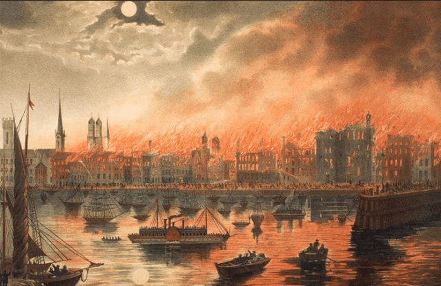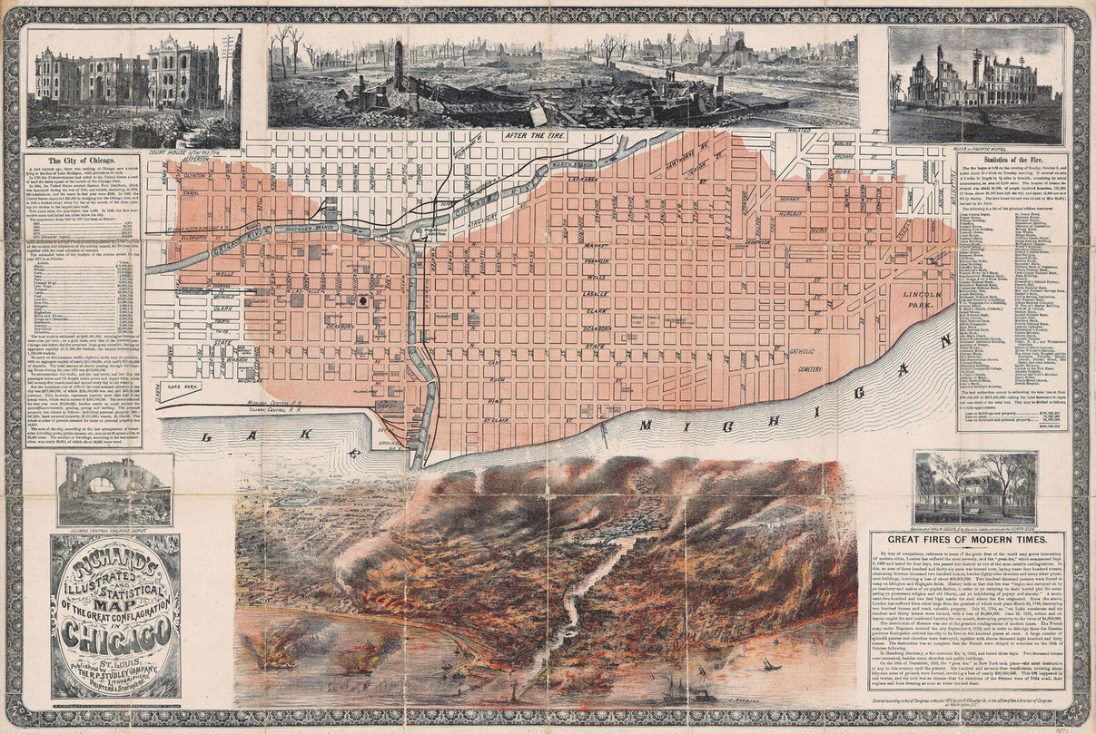 The Great Chicago Fire began on a Sunday evening in O’Leary’s barn on the south side, and burned until Tuesday morning as far north as Lincoln Park.