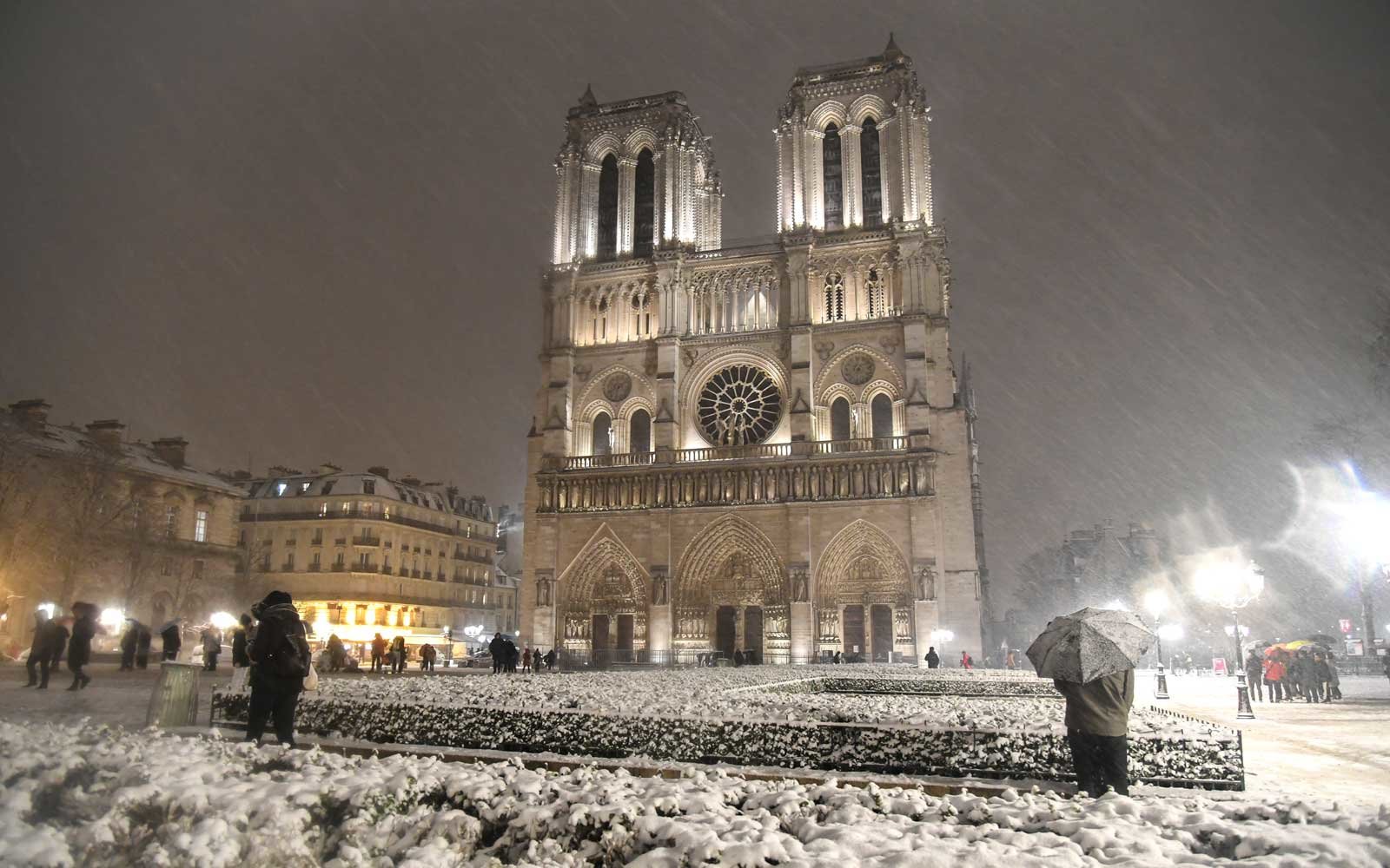 Snow storm rising up in Paris at night on 6 February 2018. (Photo by Julien Mattia/NurPhoto via Getty Images)
