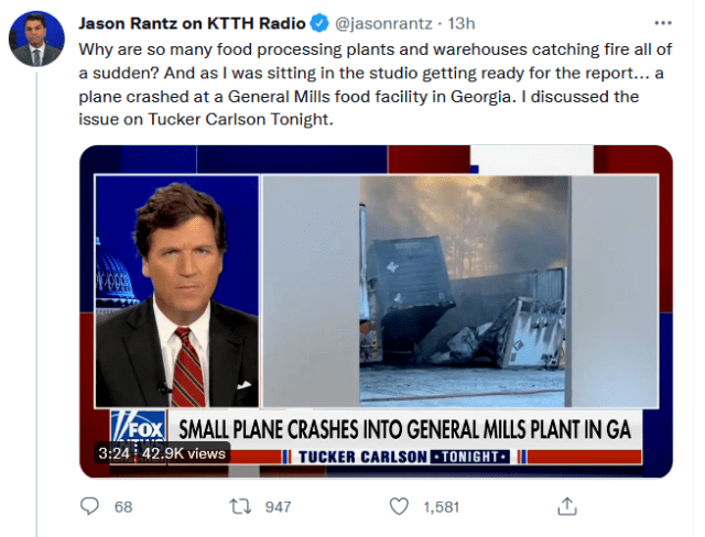 Why are so many food processing plants and warehouses catching fire all of a sudden? And as I was sitting in the studio getting ready for the report… a plane crashed at a General Mills food facility in Georgia. I discussed the issue on Tucker Carlson Tonight. pic.twitter.com/QWJ3b6j65d