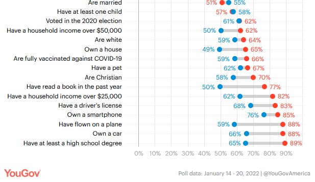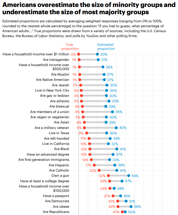 It also applies to religious minorities, such as Muslim Americans (estimate: 27%, true: 1%) and Jewish Americans (estimate: 30%, true: 2%). And we find the same sorts of overestimates for racial and ethnic minorities, such as Native Americans (estimate: 27%, true: 1%), Asian Americans (estimate: 29%, true: 6%), and Black Americans (estimate: 41%, true: 12%).