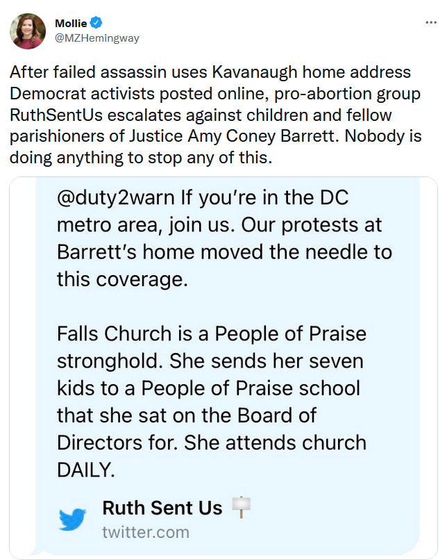 - The DOJ refuses to prosecute the protesters, even though they are breaking the law by harassing the Justices at their homes.