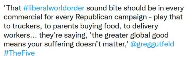 'That #liberalworldorder sound bite should be in every commercial for every Republican campaign – play that to truckers, to parents buying food, to delivery workers… they're saying, 'the greater global good means your suffering doesn’t matter,' @greggutfeld #TheFive pic.twitter.com/Aa1hMmAgH4