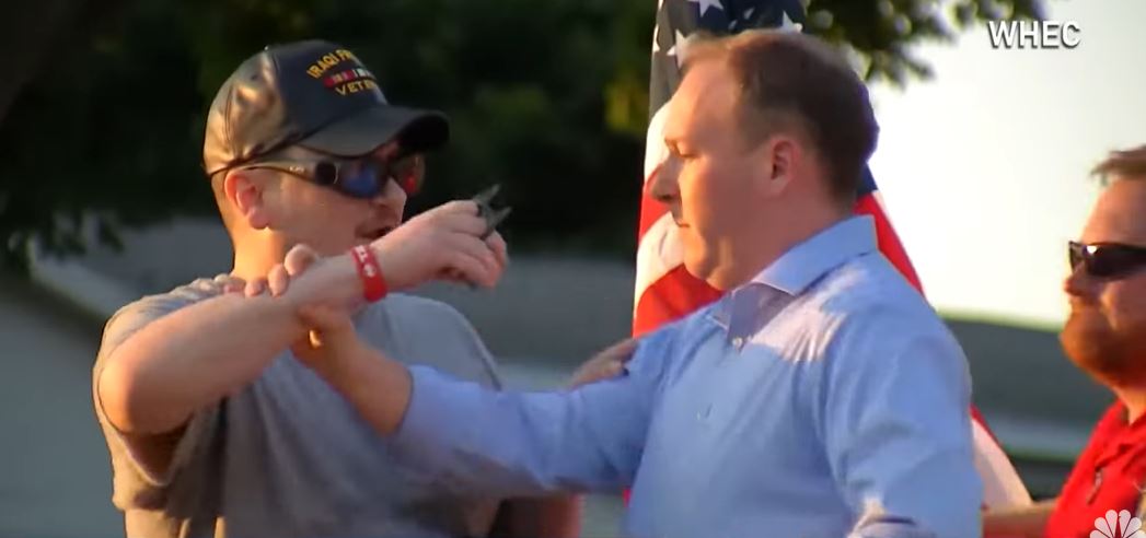 Video recorded by NBC affiliate WHEC captured the moment a man attempted to attack Rep. Lee Zeldin, R-N.Y., who is running for New York governor, at a campaign event in Perinton. The man was subdued by people in attendance and authorities took the man into custody.