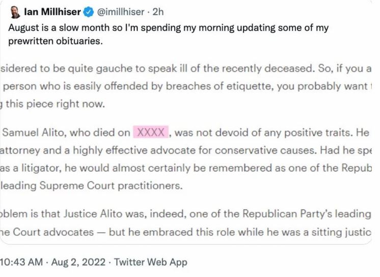 Vox ‘s Ian Millhiser tweeted and deleted a pre-written obituary for Supreme Court Justice Samuel Alito on Tuesday morning. Although it is common practice for news organizations to write obituaries for public figures prior to their death, this incitement to violence is unacceptable, considering that an assassination attempt has already been made on another Justice.