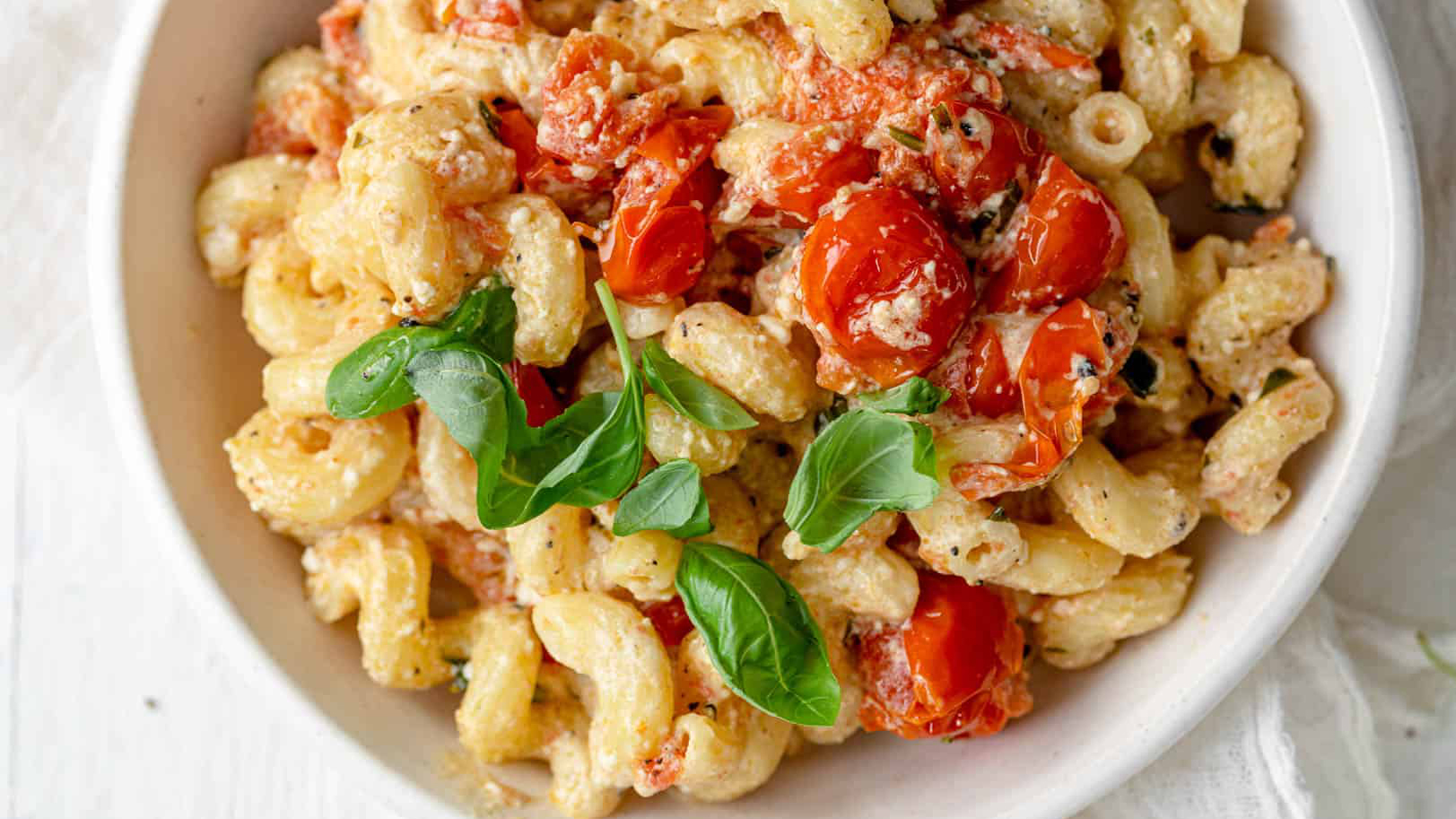Take the cheese/tomato mixture out of the oven and mush together. Add your pasta and some pasta water, if needed (I used about 1/3 cup). Stir, stir, stir, until the ingredients create a creamy sauce. Mix in your fresh basil.