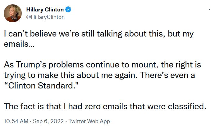 Just like Bill Clinton’s definition of “is”. I don’t know if you saw it this week, but Hillary proclaimed on Twitter: “the fact is that I had zero emails that were classified.”
