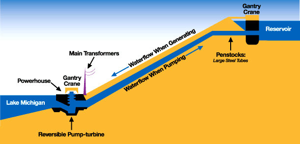 When demand for electricity rises, the plant is dispatched and water produces power like a river hydro dam turning turbines as it is released 363 feet back into Lake Michigan.