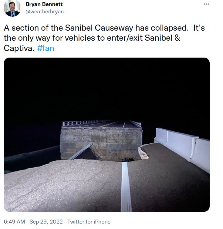 A few replies thanked Biden. LOL If Biden had been in charge, the money would have been raised, divided out between his buddies, DeSantis would have been accused of causing the hurricane, no plan of rebuilding would have been made, no workers would have been there, and everyone in D.C. would have already on onto something else. In other words……no bridge.