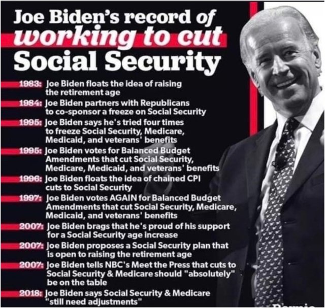 Dem politicians and their friends are saying that Republicans will cut or eliminate Social Security and Medicare if they regain a majority in Congress. The Jean-Pierre creature mentions it at the end of the above-posted video. While I think that reforming these programs is probably smart, because the money will eventually run out as things stand now, Joe Biden himself has repeatedly voted to cut/freeze benefits, and raise the age to receive benefits. That is a fact.