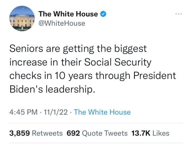 This tweet has since been deleted, because it was a deliberate bending of the truth, and the White House was publicly shamed on Twitter. The 2023 increase in the Social Security benefit has nothing to do with Joe Biden.