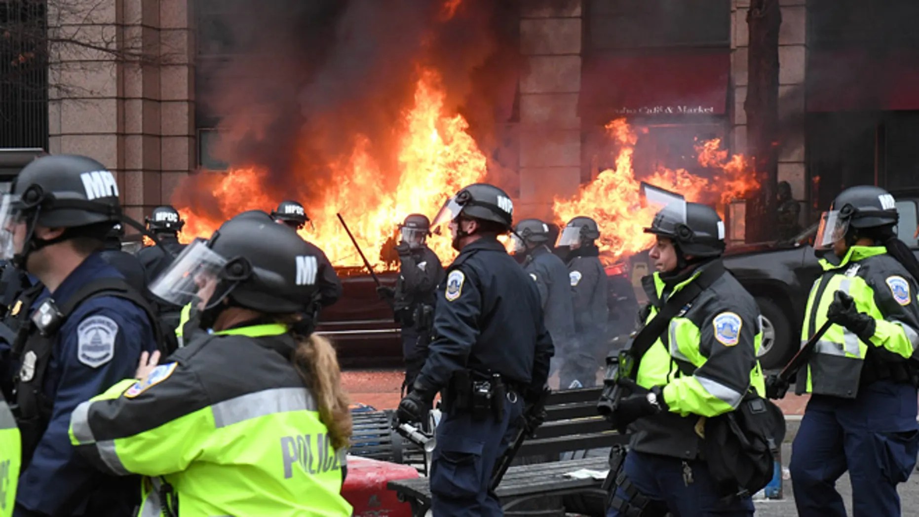 A protester stands in front of a riot police line during a demonstration after the inauguration of President Donald Trump, Friday, Jan. 20, 2017, in Washington. (AP Photo/John Minchillo)
