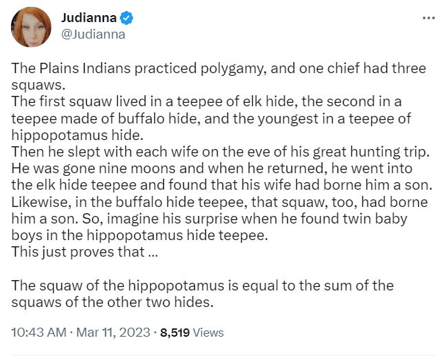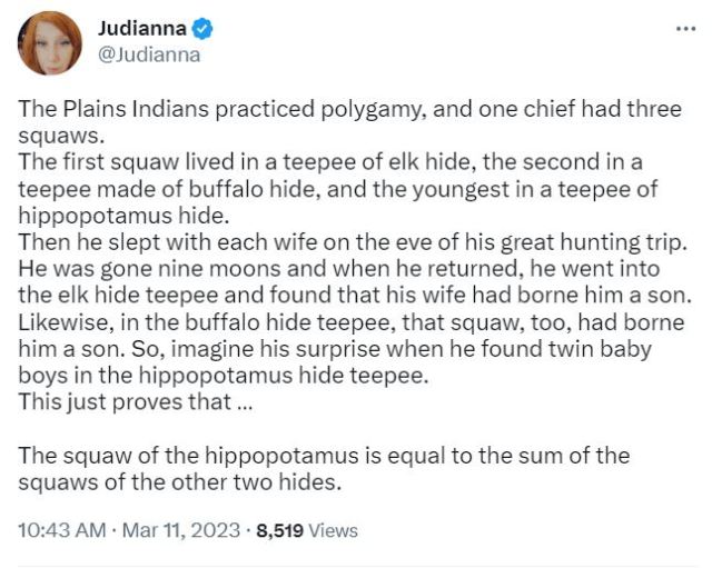 I posted that joke on my blog once, and got chewed out by a reader who informed me that “squaw” was a racist slur and I should be ashamed of myself. It’s amazing how wokeness destroys humor.