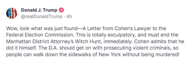 The letter appears to be in direct conflict with Cohen’s sworn testimony to Congress given a year later.