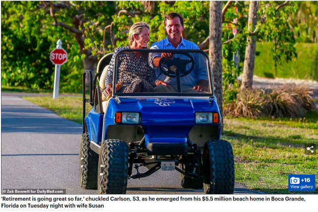 Dad-of-four Carlson zoomed off in a golf cart without elaborating on reports that he was ‘blindsided’ by Monday’s shock announcement that he was ‘parting ways’ with Fox – despite being the network’s biggest prime-time star.