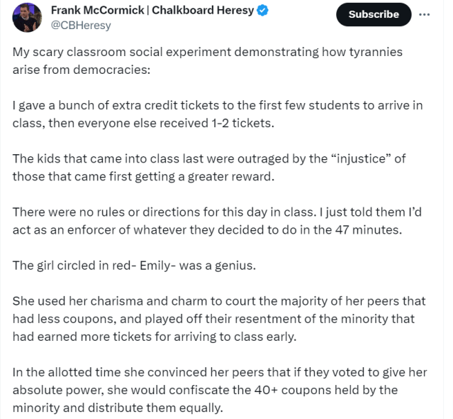Similar to that lesson you teach your kids about taxes. Give them an ice cream cone, then eat 30% before you give it to them and explain that’s how taxes work. People take your stuff who did nothing to earn it. 😉