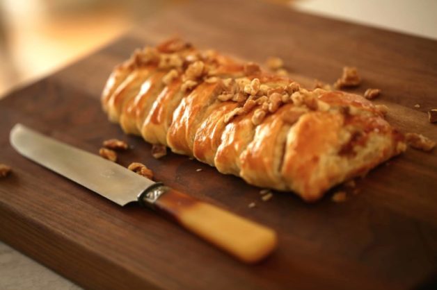 - Transfer braid to a cutting board. Sprinkle with chopped walnuts and serve with knife for easy slicing.