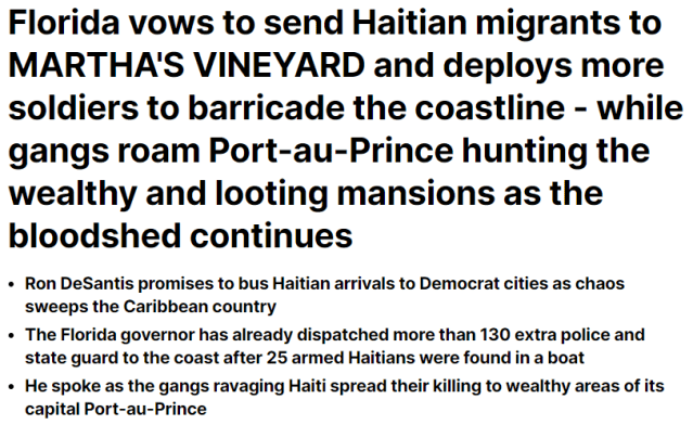Ron DeSantis has threatened to send Haitian migrants to leafy Democrat enclaves in the north as gang warfare engulfs the embattled Caribbean nation.