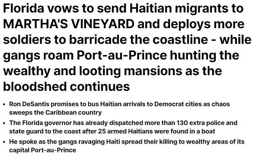 Ron DeSantis has threatened to send Haitian migrants to leafy Democrat enclaves in the north as gang warfare engulfs the embattled Caribbean nation.