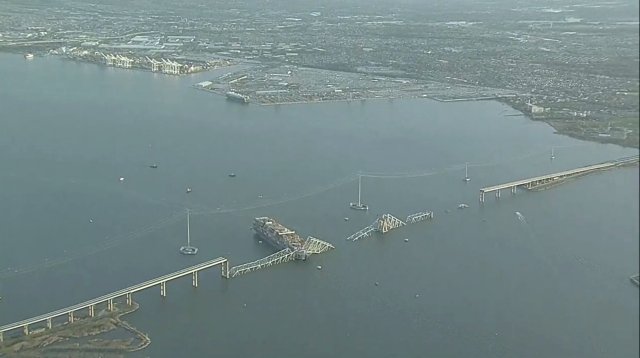 The large vessel rammed one of the support columns of the bridge at about 1:30 a.m., causing the entire structure to break into several pieces and fall into the Patapsco River, video posted to X (formerly Twitter) showed. The ship then caught fire, and thick smoke could be seen billowing out of it. Local authorities were initially looking for seven people in the river, and two have already been pulled out, according to the Associated Press. It was unclear if the two already rescued were included in the seven.