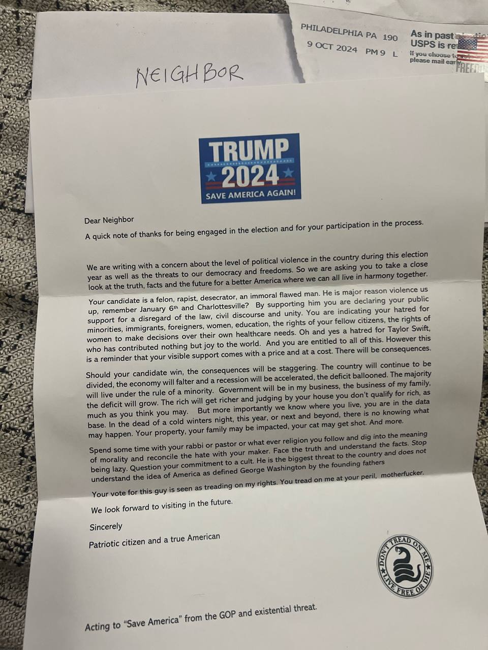 The Post Millennial has learned that some voters in the Philadelphia said they have received threatening letters sent through the US Postal Service using a facsimile of a Trump campaign letterhead. The printed letters begin with the salutation “Dear Neighbor” before briefly mentioning reasons not to vote for Donald Trump and JD Vance but then dive headlong into outright threats. The writer claims, “We know where you live, you are in the data base,” “there is no knowing what may happen,” and “your family may be impacted, your cat may get shot.”