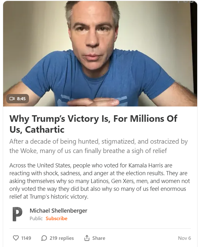 MICHAEL SHELLENBERGER: People who voted for Kamala Harris are reacting with shock, anger, and sadness at the election results. They’re asking themselves why so many Latinos, Gen Xers, men and women, not only voted the way they did, but why so many of us feel enormous relief at Trump’s historic victory. But do they really not understand, or do they not want to understand?